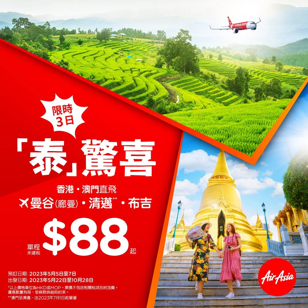 2023年05月05日港澳訊 – 亞洲低成本航空領導品牌AirAsia為讓更多旅客發掘精彩泰國的魅力,即日起為港澳地區旅客推出限時3日快閃機票優惠,直飛泰國航點單程未連稅超值價格僅由 HKD/MOP 88*起。