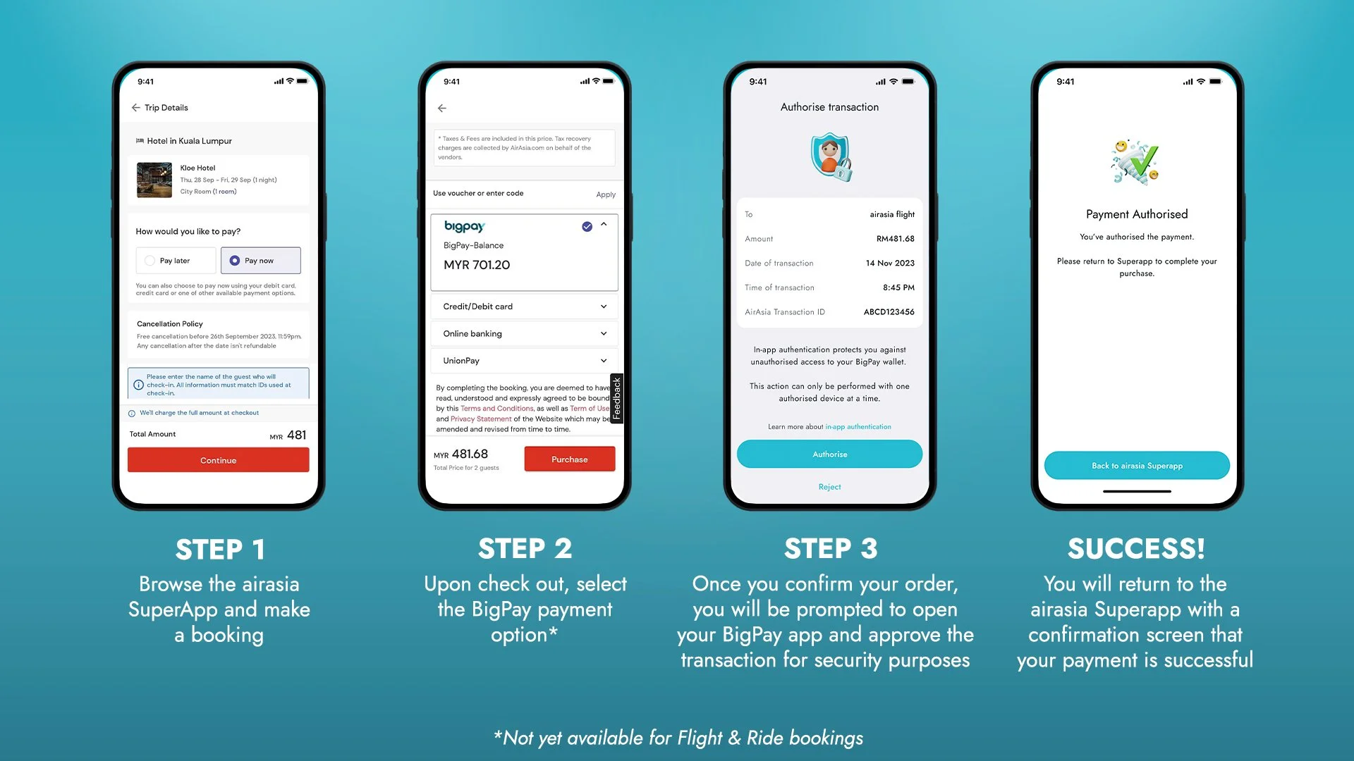 Untuk menikmati pengalaman pembayaran yang lancar melalui BigPay, pengguna airasia Superapp hanya perlu pautkan akaun BigPay mereka ke airasia Superapp yang hanya mengambil masa kurang dari seminit. Setelah pautan akaun mereka ke airasia Superapp telah dilakukan, pengguna boleh menyemak baki dan membuat pembayaran di dalam aplikasi tersebut. Dalam bulan yang mendatang, pengguna juga boleh mendaftar akaun BigPay secara terus di aplikasi tersebut.