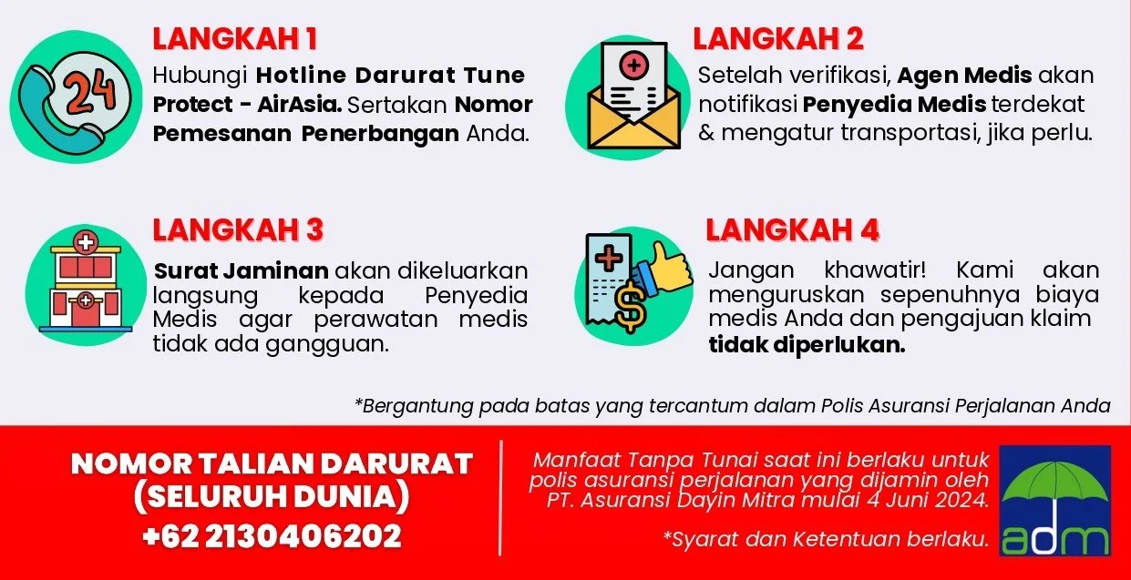 AirAsia Comprehensive Travel PLUS menyediakan akses ke lebih dari 5.000 rumah sakit di seluruh dunia melalui kerja sama dengan penyedia layanan perawatan dan mobilitas ternama, Europ Assistance, serta PT Asuransi Dayin Mitra Tbk sebagai penjamin asuransi. Fitur ini menghilangkan biaya tak terduga, memberikan keamanan untuk perjalanan tanpa rasa khawatir. Dengan memadukan pengalaman perjalanan yang lancar dengan perlindungan asuransi yang komprehensif, Tune Protect dan AirAsia mendefinisikan ulang pengalaman perjalanan bagi penumpang di seluruh dunia.