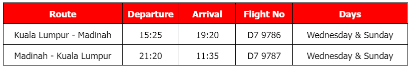 The inaugural flight D7 786 departed from Kuala Lumpur International Airport (Terminal 2) at 3:25PM on 4 August 2024 and landed at Prince Mohammad Bin Abdulaziz International Airport (Madinah Airport) at 7:20PM (local time) carrying 243 passengers or over 85% load factor.