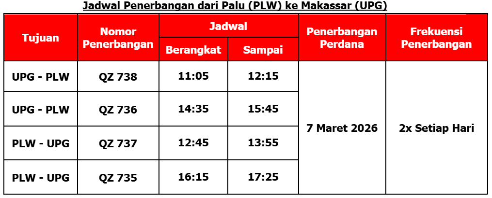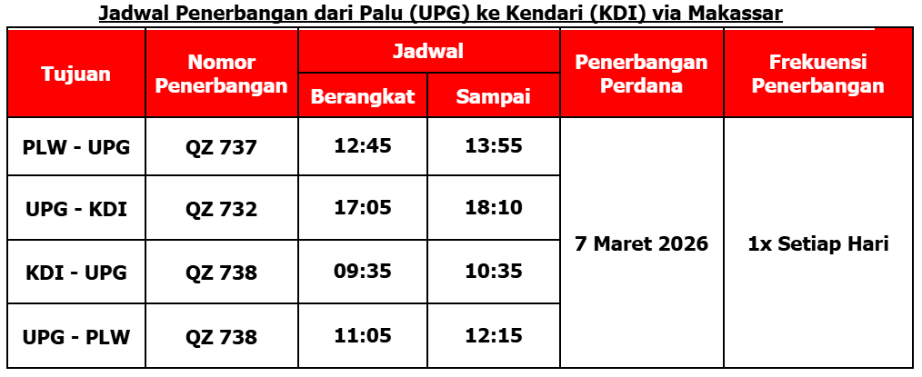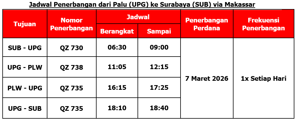 Palu, 2 Februari 2026 – Maskapai berbiaya hemat terbaik dunia versi Skytrax, Indonesia AirAsia, memperluas pilihan perjalanan dari Palu menuju Surabaya dan Kendari melalui Makassar mulai 7 Maret 2026. Layanan ini berperan sebagai penghubung antar kota di Pulau Sulawesi, termasuk membuka akses yang lebih mudah dari Sulawesi Tengah menuju Sulawesi Selatan dan Sulawesi Tenggara, sekaligus menghadirkan koneksi ke Pulau Jawa.