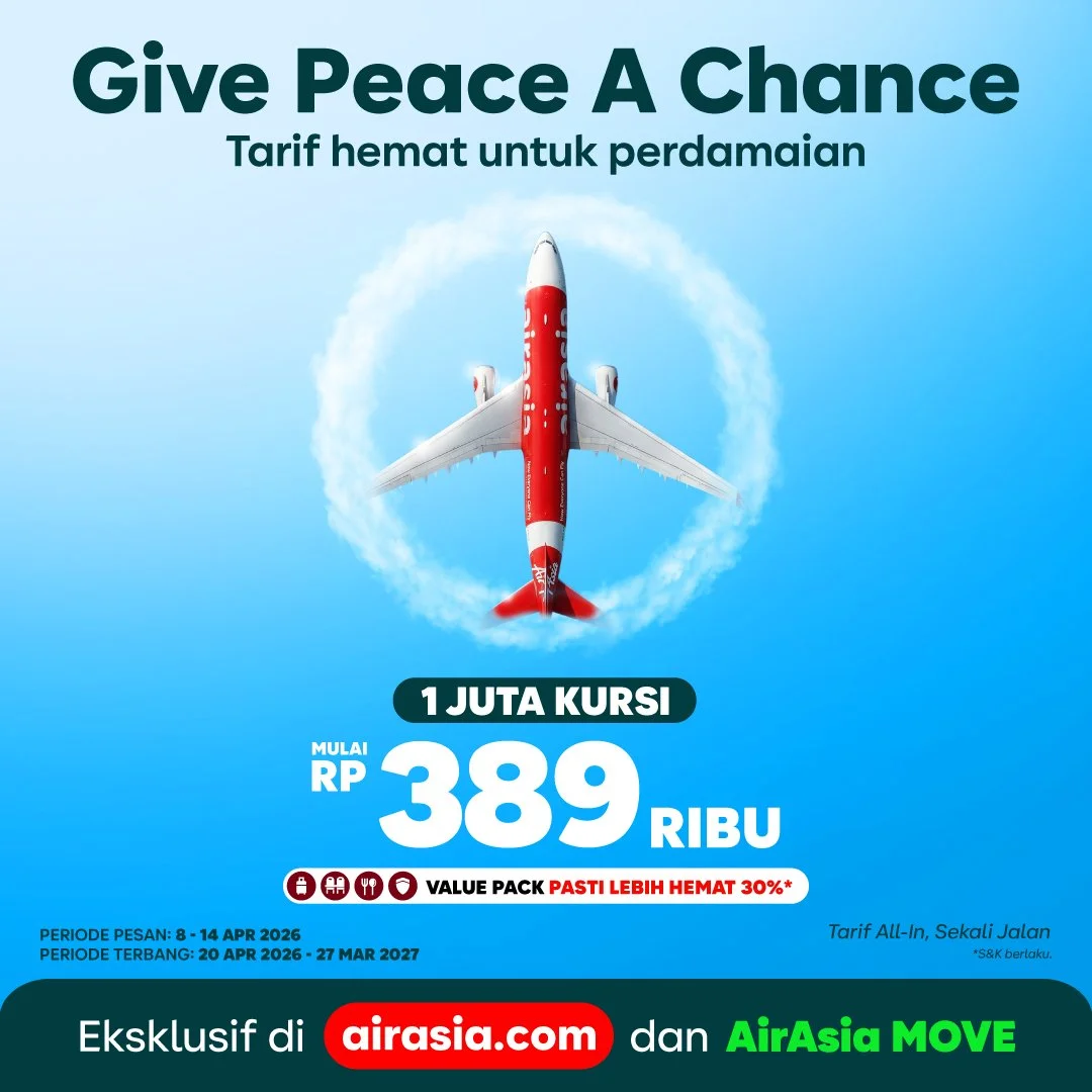 Jakarta, 8 April 2026 – AirAsia hari ini meluncurkan kampanye “Give Peace a Chance” sebagai bagian dari komitmen perusahaan dalam menghadirkan perjalanan yang mudah diakses dan terjangkau. Kampanye ini diperkenalkan di tengah ketidakpastian situasi global yang turut mempengaruhi cara masyarakat hidup, bekerja, dan bepergian.