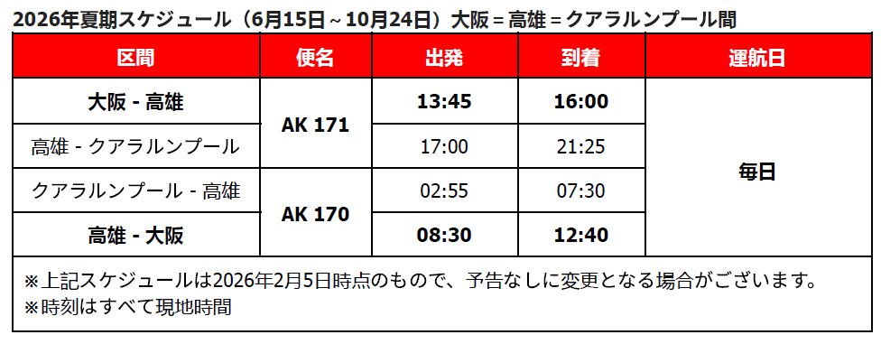Tokyo, 5 February 2025 - エアアジア・マレーシア(AK)は、2026年6月15日(月)より、大阪=高雄=クアラルンプール線を新規開設いたします。本路線は、エアアジア・マレーシアが以遠権を活用し、上記3都市をデイリー運航で結ぶものです。機材は、エアバスA320を投入予定。運航スケジュールは以下の通りです。