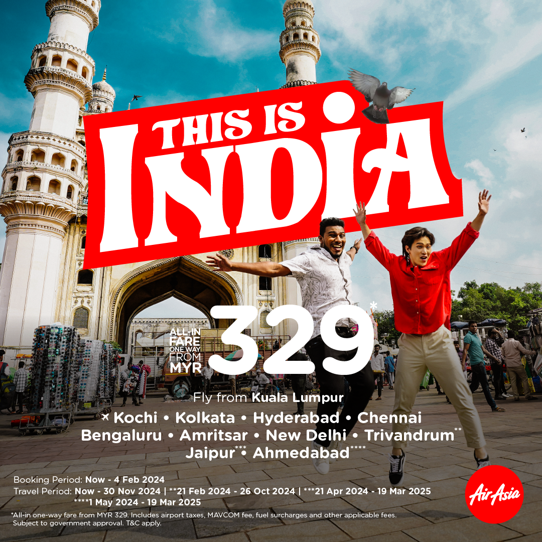 சிப்பாங் ஜன 2 - ஏர் ஆசியா இன்று 'இது தான் இந்தியா'பிரச்சாரத்தை தொடங்கியது, இதன் வழி கோலாலம்பூரிலிருந்து இந்தியாவில் ஏர் ஆசியாவின் மாபெரும் தொடர்பின் வழி 12 அற்புதமான நகரங்களுக்கு வியக்க தக்க வகையில் மலிவு கட்டணங்களை ஏர் ஆசியா வழங்குகிறது.அனைத்தும் அடங்கிய வெ 329 ஒரு வழி பயண கட்டணத்திலிருந்து அற்புத இந்தியாவின் சென்னை, திருச்சிராப்பள்ளி, கொச்சின், ஹைதராபாத், பெங்களூரு, கல்கத்தா, புது டில்லி, அமிர்தரஸ், திருவானந்தபுரம்(2024 ஏப்ரல் 21 முதல்), ஜெய்ப்பூர்(2024 ஏப்ரல் 21 முதல்), விசாகப்பட்டினம் (2024 ஏப்ரல் 26 முதல்) மற்றும் அமெடபாத்(2024 மே 1 முதல்) தொடங்குகிறது. இதன் வழி இந்தியாவிலிருந்து கோலாலம்பூருக்கு பயணிக்கும் சுற்றுப்பயணிகள் ஒரு வழி கட்டணமாக ரூபாய் 7,835 செலுத்தி டிக்கெட்டுகளை பதிவு செய்து கொள்ளலாம்.பிப்ரவரி 2 மற்றும் 30 நவம்பர் 2024 இடையே பயணம் செய்ய இப்பொழுது முதல் 2024 பிப்ரவரி 4க்குள் டிக்கெட்டுகளை பதிவு செய்து கொள்ளலாம்