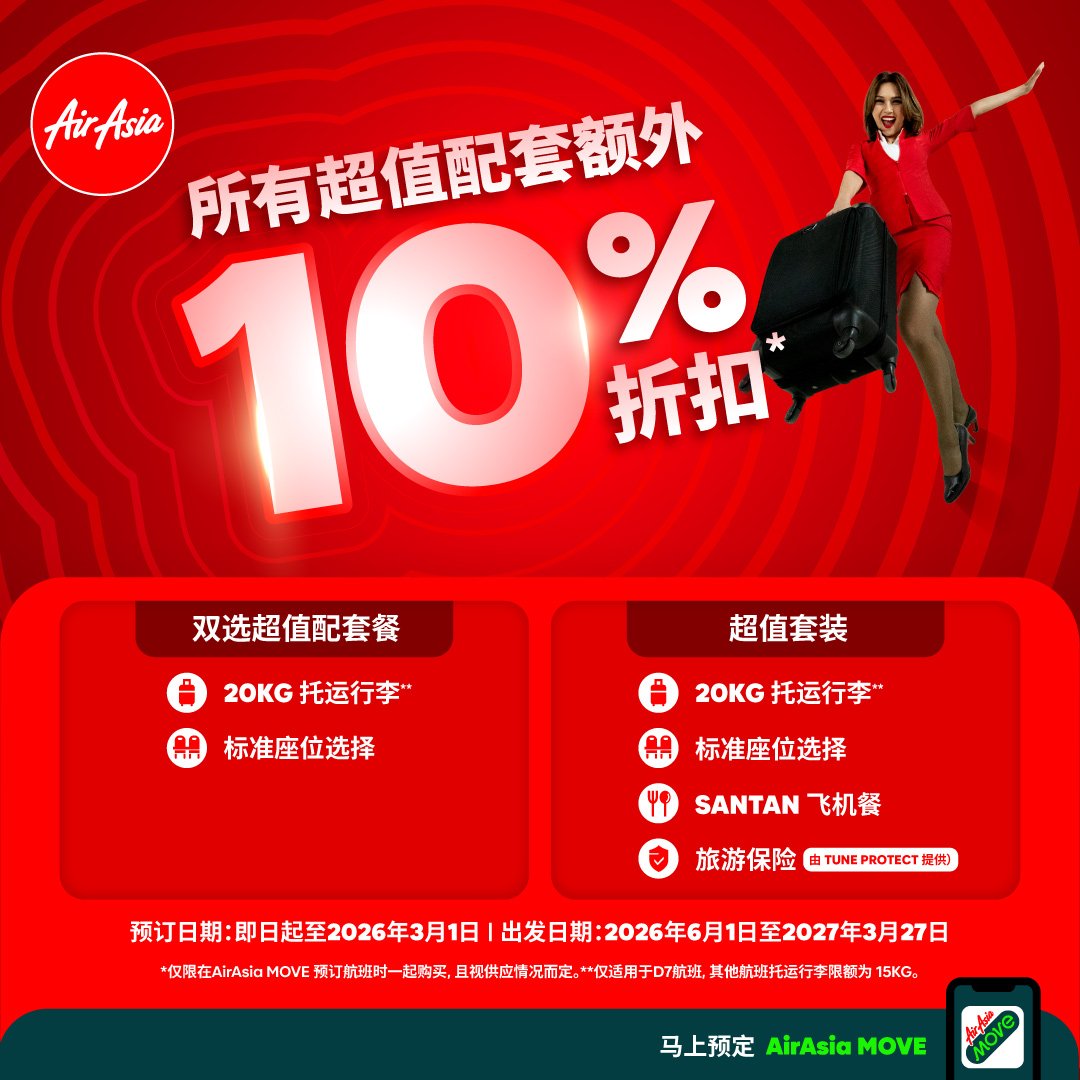 即日起至2026年3月1日,所有亚航及亚航长程航班(航班代码AK和D7)的航线,均可享受最高99%*的折扣,出发日期为2026年6月1日至2027年3月27日。乘客只需可通过airasia.com或AirAsia MOVE应用程序进行预订。立即抢购促销机位,尽享特惠票价,开启您的下一段精彩旅程!