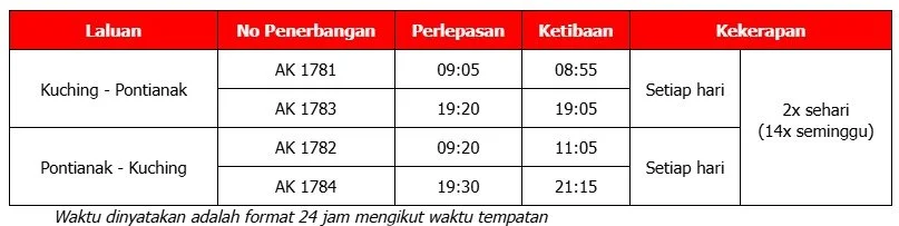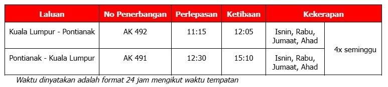 Jadual Penerbangan antara Kuala Lumpur (KUL) dan Pontianak (PNK):