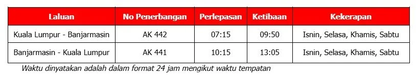 Jadual Penerbangan antara Kuala Lumpur (KUL) dan Banjarmasin (BDJ):