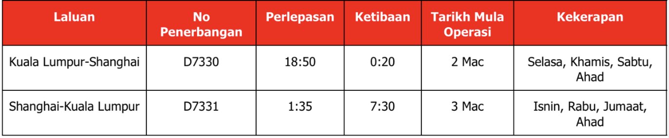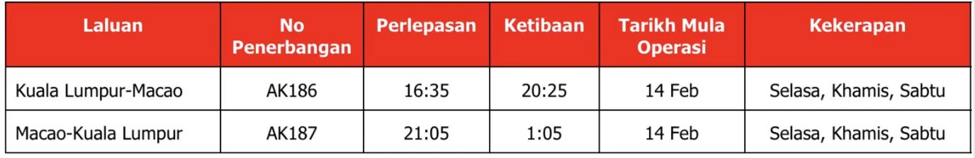 AirAsia Malaysia (AK) menawarkan tambang termasuk semua* untuk pengembara yang membuat perjalanan penting daripada RM151 sehala dari Kuala Lumpur dan Kota Kinabalu ke Macau, Shenzhen, Guangzhou dan Kunming. Terbang lebih jauh dengan AirAsia X Malaysia (D7) dari Kuala Lumpur ke Shanghai, Hangzhou dan Chengdu dengan tambang termasuk semua daripada RM899 sehala untuk tempat duduk Ekonomi atau RM2,199 untuk tempat duduk Premium Flatbed.
