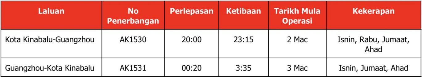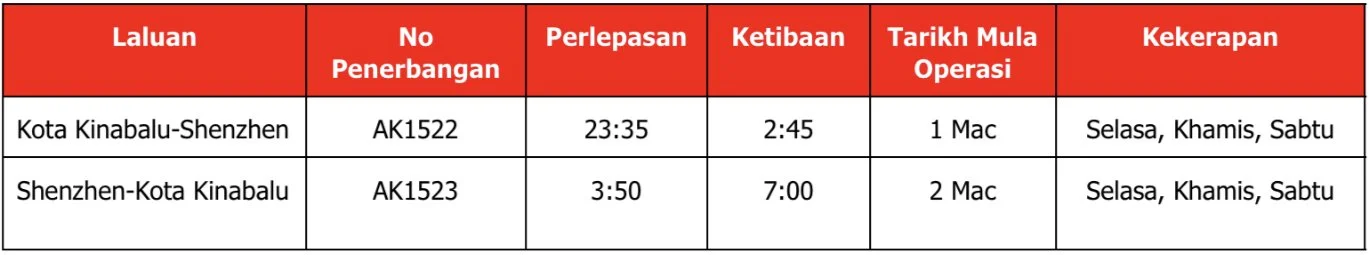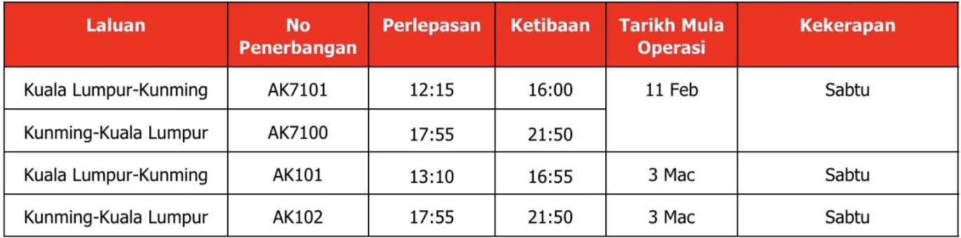AirAsia Malaysia (AK) bakal terbang semula ke empat destinasi di China dari dua hab - Kuala Lumpur dan Kota Kinabalu ke Macao, Shenzhen, Guangzhou dan Kunming dengan kekerapan 10 penerbangan mingguan, dengan rancangan untuk meningkatkan kekerapan sehingga 27 penerbangan mingguan pada bulan Mac. Penerbangan pertama ke/dari China dimulakan semula pada 10 Februari 2023 lalu ke/dari Guangzhou dengan faktor muatan tinggi untuk penerbangan dua hala.