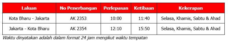 Bagi meraikan pelancaran laluan baharu ini, AirAsia menawarkan tambang promosi istimewa untuk penerbangan dari Kota Bharu ke Jakarta bermula daripada RM199* untuk termasuk semua sehala. Penerbangan dari Jakarta ke Kota Bharu juga boleh didapati bermula daripada IDR709,000* termasuk semua sehala. Tambang istimewa ini boleh ditempah mulai hari ini sehingga 22 Mac untuk tempoh perjalanan antara 16 Jun 2026 dan 27 Mac 2027, secara eksklusif melalui aplikasi AirAsia MOVE dan laman web airasia.com.