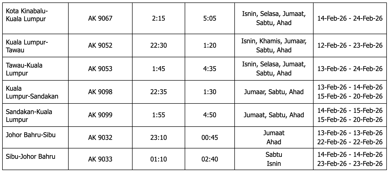 Penerbangan bagi Hari Raya juga ditawarkan pada harga RM328 sehala semua termasuk ke Sarawak dan RM398 termasuk semua sehala ke Sabah iaitu laluan dari Kuala Lumpur ke Kuching, Miri, Sibu, Bintulu, Kota Kinabalu, Tawau dan Sandakan. Tempah mulai hari ini sehingga 26 Mac 2026 dan lakukan perjalanan antara 18 hingga 26 Mac 2026 untuk menikmati penerbangan pada tambang tetap.