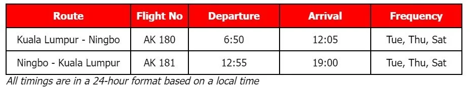 Flight Schedule between Kuala Lumpur (KUL) and Ningbo (NGB):