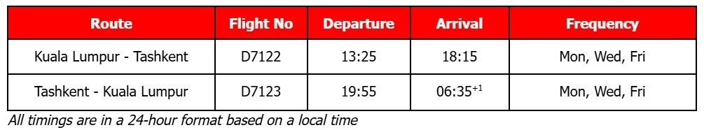 Starting from 15 October 2025, AAX will operate three weekly flights between Kuala Lumpur and Tashkent. Travellers from Singapore will be able to conveniently access this route by choosing their preferred layover duration, with 11 daily flights available between Singapore and Kuala Lumpur.