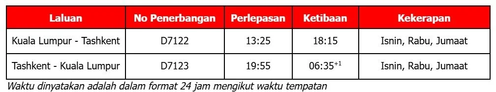 *Tambang pengenalan termasuk semua adalah untuk perjalanan sehala sahaja dan termasuk cukai lapangan terbang, yuran kawal selia, caj bahan api, cukai berkaitan dan yuran yang dikenakan. Tempat duduk adalah terhad dan berdasarkan tempahan terdahulu bermula 23 Jun 2025. Hanya untuk penerbangan yang berlepas dari Kuala Lumpur, Malaysia. Tertakluk kepada terma dan syarat lain.