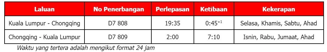 AirAsia X (kod penerbangan D7) akan mengendalikan empat penerbangan mingguan dari Kuala Lumpur ke Chongqing bermula 15 Oktober 2024. Dengan penambahan laluan Chongqing, syarikat penerbangan ini akan terbang ke sembilan destinasi di China, termasuk Changsha, Xi’an, Chengdu (Tianfu) dan destinasi yang lain dengan jumlah keseluruhan 53 penerbangan mingguan.