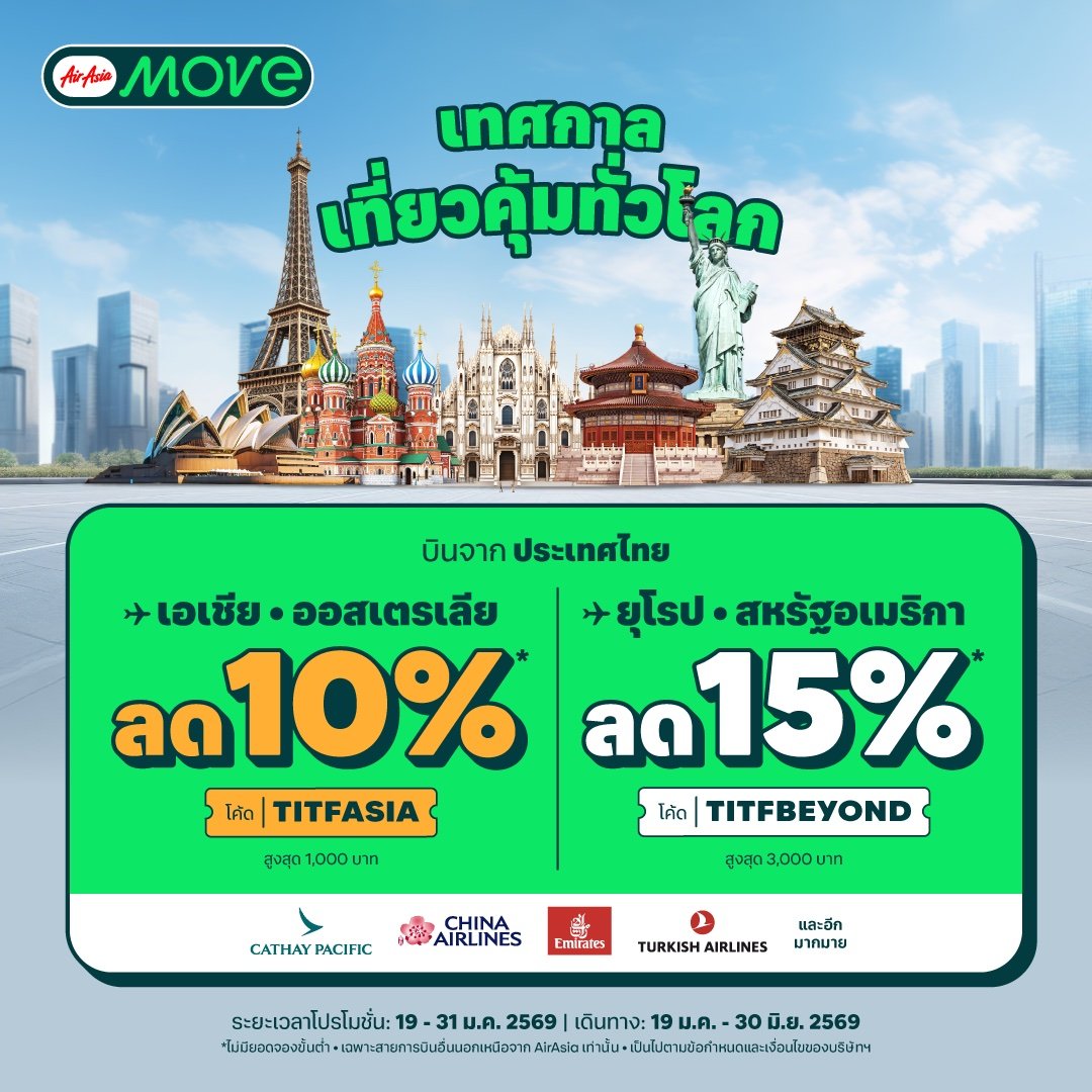 เก็บกระเป๋าด่วน! AirAsia MOVE จัดเต็ม International Travel Fair 2026 แจกส่วนลดบินโกอินเตอร์ สูงสุด 15% ทั้งเอเชีย ออสเตรเลีย ยุโรป และอเมริกา!