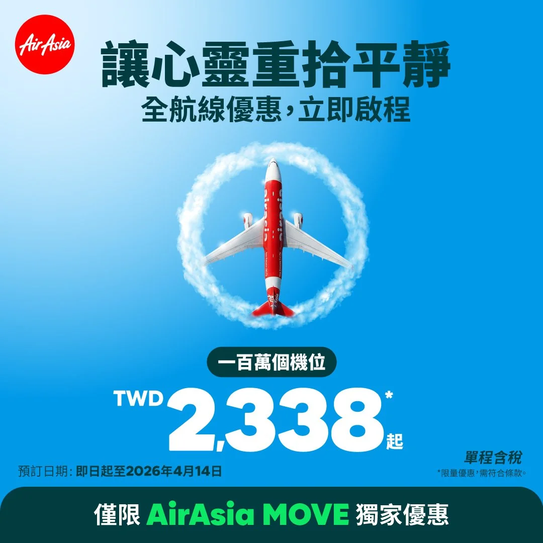 台灣,2026年4月8日訊 –亞洲低成本航空領導品牌 AirAsia 今(8)宣布推出「Give Peace a Chance」活動,在全球局勢持續變動之際,持續致力於讓旅行更普及且可負擔的品牌使命,期盼藉由旅行讓心靈獲得片刻喘息與沉澱,並進一步加深人與人之間的連結與和平價值。