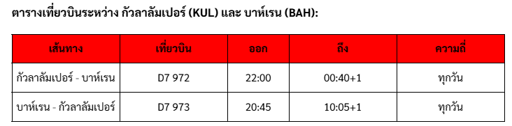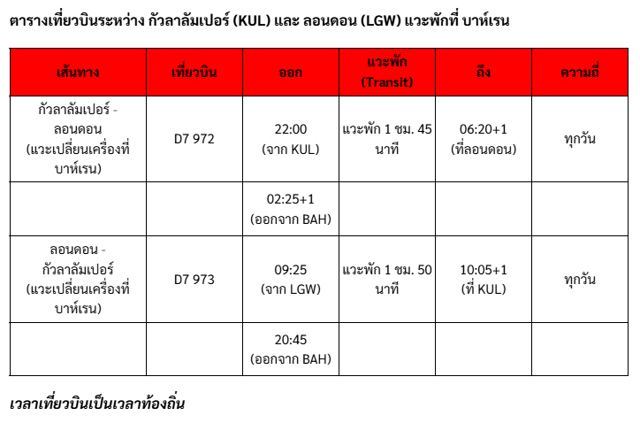 บาห์เรน วันที่ 11 กุมภาพันธ์ 2569 - แอร์เอเชีย เอ็กซ์ (รหัสเที่ยวบิน D7) ฉลองความสำเร็จครั้งสำคัญตามแผนยุทธศาสตร์ขยายเครือข่ายระดับโลก ประกาศเปิดตัวเส้นทางบินระยะไกลที่หลายคนรอคอย เชื่อมต่อกรุงกัวลาลัมเปอร์สู่ราชอาณาจักรบาห์เรน และบินต่อเนื่องไปยังกรุงลอนดอน (สนามบินแกตวิก) สหราชอาณาจักร (เส้นทาง KUL-BAH-LGW)