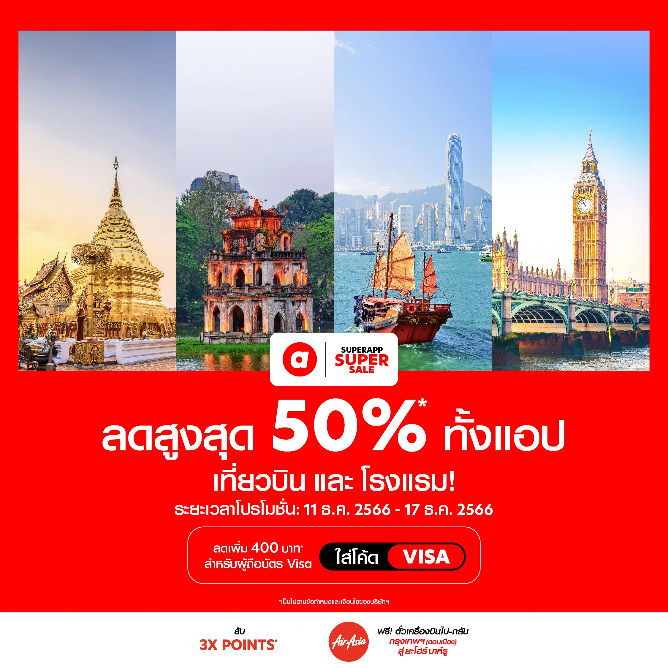 โปรใหญ่ เที่ยวคุ้มปลายปี ลดทั้งแอป ลดสูงสุด 50%* ในช่วง Superapp Super Sale พร้อมส่วนลดพิเศษผู้ถือบัตร VISA เมื่อจองเที่ยวบินสายการบินพันธมิตร โรงแรม และแพ็กเกจสุดคุ้ม เที่ยวบิน+ที่พัก