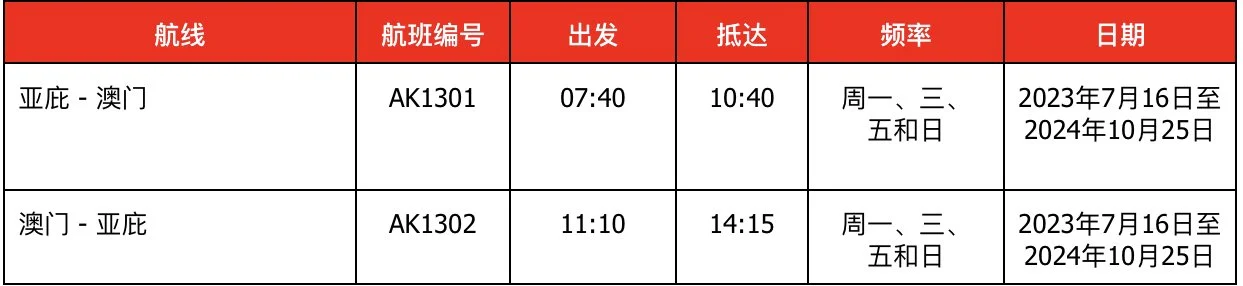 马来西亚亚洲航空 (AK) 目前有 14 条往返中国的航线,每周超过 104 趟航班从吉隆坡飞往桂林、泉州、广州、昆明、深圳、南宁、汕头和澳门;亚庇飞往广州、深圳、武汉、北京、澳门;和新山飞往广州。