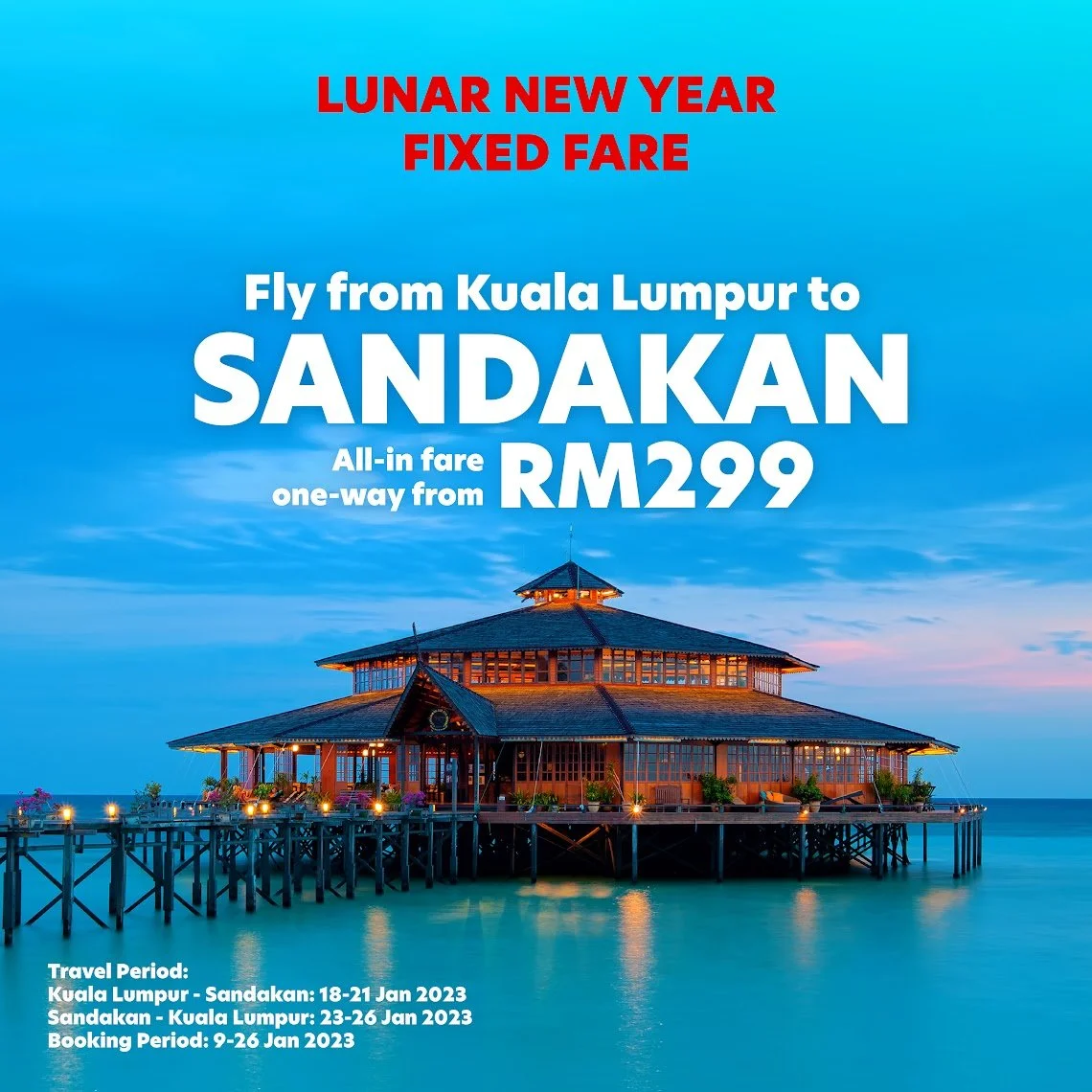 亚航为即将到来的农历新年 推出飞往山打根的固定低票价特别航班 雪邦,2023 年 1 月 9 日 - 亚航于今天以 RM299 的固定低票价推出吉隆坡和山打根之间的特别额外航班,以迎接即将到来的农历新年庆祝活动。固定票价:吉隆坡和山打根之间的单程票价为 RM299预订时间:2023年1月9日至26日旅行时间:从吉隆坡飞往山打根- 1月18日至21日从山打根飞往吉隆坡- 1月 23日至26日全包固定票价仅适用于单程旅行,包括机场税、MAVCOM 费用、燃油附加费和其他适用费用。 Airlines, Malaysia, News, 简体中文M AJanuary 9, 2023雪邦 Facebook0 Twitter LinkedIn0 0 Likes