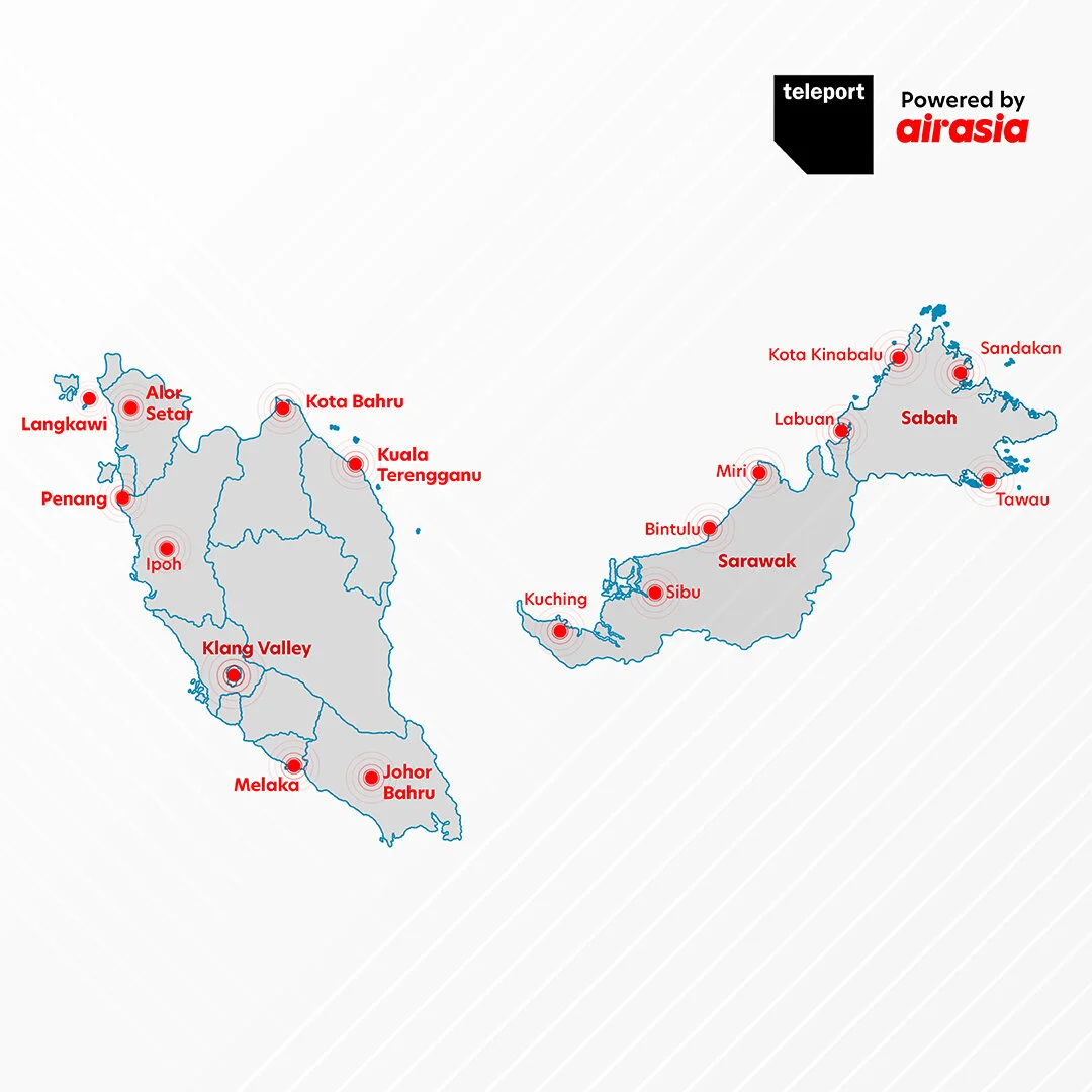 在马来西亚,Teleport已在巴生谷、亚庇、山打根、斗湖、纳闽、古晋、美里、民都鲁、诗巫、亚罗士打、怡保、新山、瓜拉丁加奴、哥打巴鲁、兰卡威、槟城和马六甲提供服务。