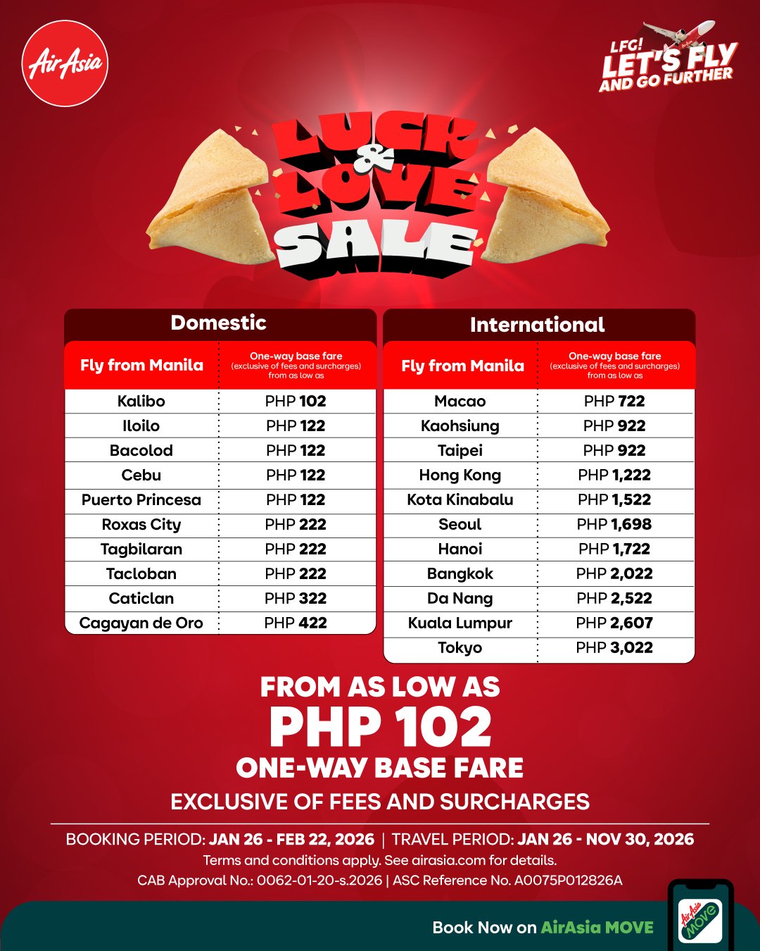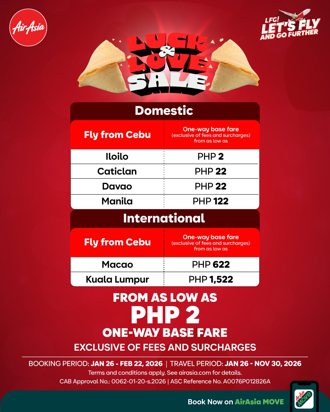 10 Feb 2026, Manila, Philippines — This February, as love and good fortune fill the season, AirAsia Philippines rolls out its ‘Luck and Love’ promo, offering one-way base fares from as low as ₱2 from Cebu and Manila.